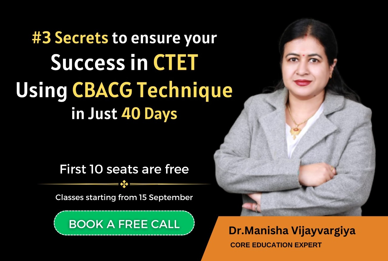 Dr. Manisha Vijayvargiya, From the last 7 years has been working With Thousand of Students ,helping them to Crack C.T.E.T achieve Lakhs of Rupees Via My C.B.A.C.G Technique .She is a Professor & a Core Education Expert and she believe that the best way to Learn is to teach and solve her students problem through her technique along with guidance & Counselling.